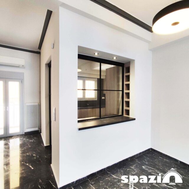 Οι φωτιζόμενες κατασκευές, ξενοδοχειακού τύπου κατασκευάστηκαν κατόπιν ειδικής παραγγελίας και ο χώρος της κουζίνας σε σχέση με το καθιστικό αλλά και σε πλήρη απομόνωση έδωσε έναν ιδιαίτερο χαρακτήρα στο διαμέρισμα.