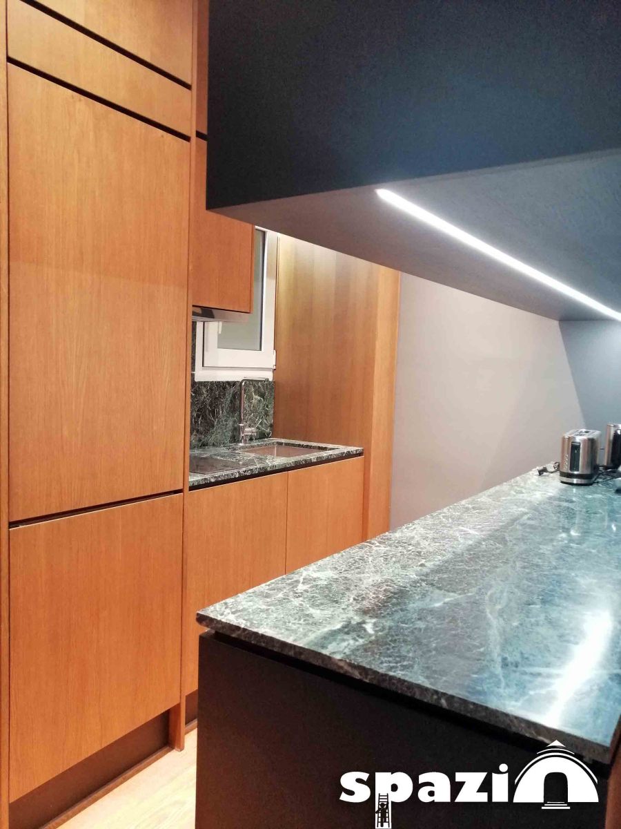 Το διαμέρισμα πρώτου ορόφου σε πολυκατοικία στο κέντρο της Αθήνας, ανακαινίστηκε και εντυπωσιάζει!. Τα μόλις 49τ.μ. του δαπέδου επενδύθηκαν με προγυαλισμένο παρκέ και οι τοίχοι με γρανιτόπλακες αρίστης ποιότητας. Οι ξύλινες ειδικές κατασκευές των επίπλων σε καθιστικό, υπνοδωμάτιο αλλά και κουζίνα προσδίδουν άλλο κύρος σε μια μοντέρνα αλλά και ταυτόχρονα ποιοτική ανακαίνιση. Οι ψευδοροφές και οι κρυφοί φωτισμοί δεν θα μπορούσαν να απουσιάζουν ενώ ταυτόχρονα αναδεικνύουν τόσο τον καπλαμά με το λούστρο όσο και τις λάκες των επίπλων. Η ανακαίνιση και η κατασκευή όλης της επίπλωσης, ολοκληρώθηκε από την Spazio, βάση μελέτης Διακοσμητή.